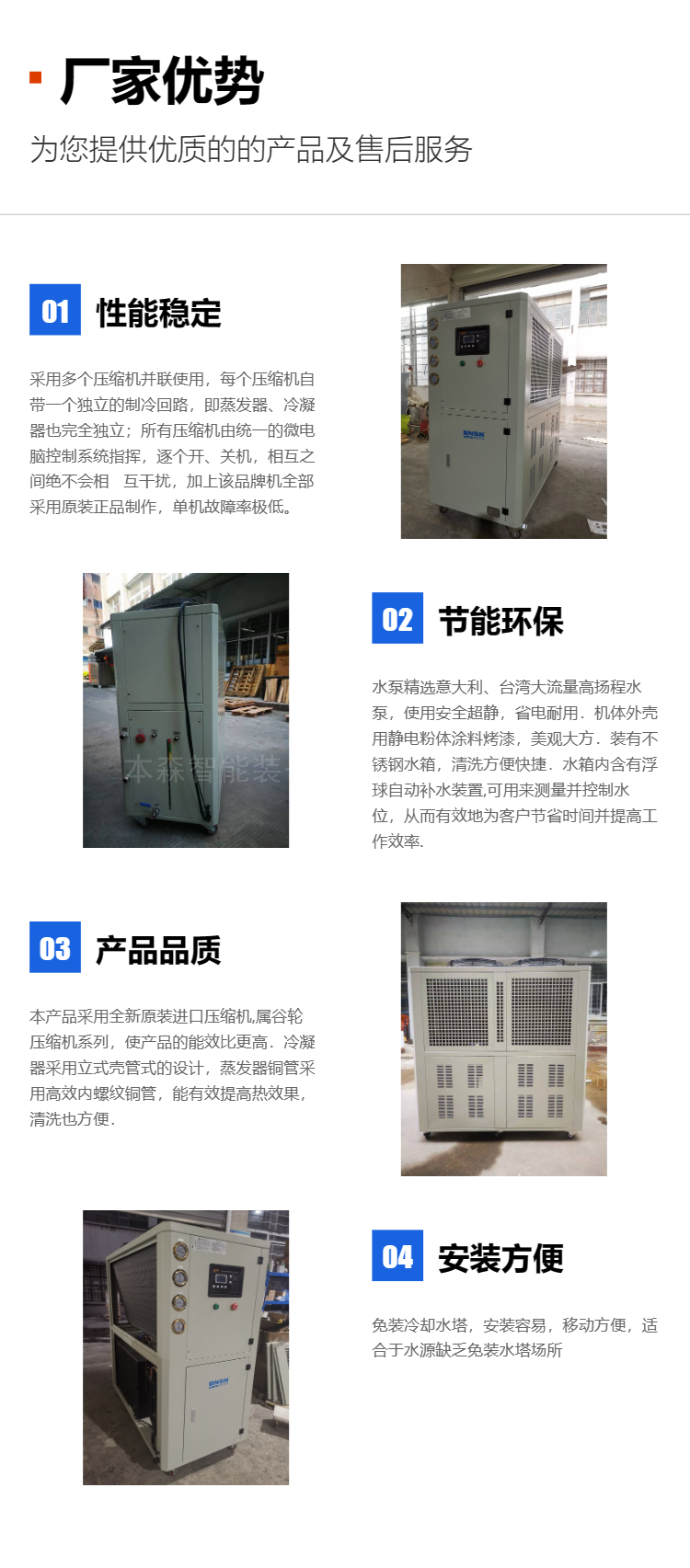 1、性能稳定: 采用多个压缩机并联使用,每个压缩机自带一个独立的制冷回路,即蒸发器、冷凝器也完全独立 ;所有压缩机由统一的微电脑控制系统指挥,逐个开、关机,相互之间绝不会相互干扰,加上该品牌机全部采用原装正品制作,单机故障率极低, 综合以上原因,可以保证该系列机有着高度稳定的性能,在长年连续运行情况下之首选,而无需再购其它备用机。